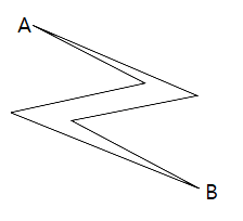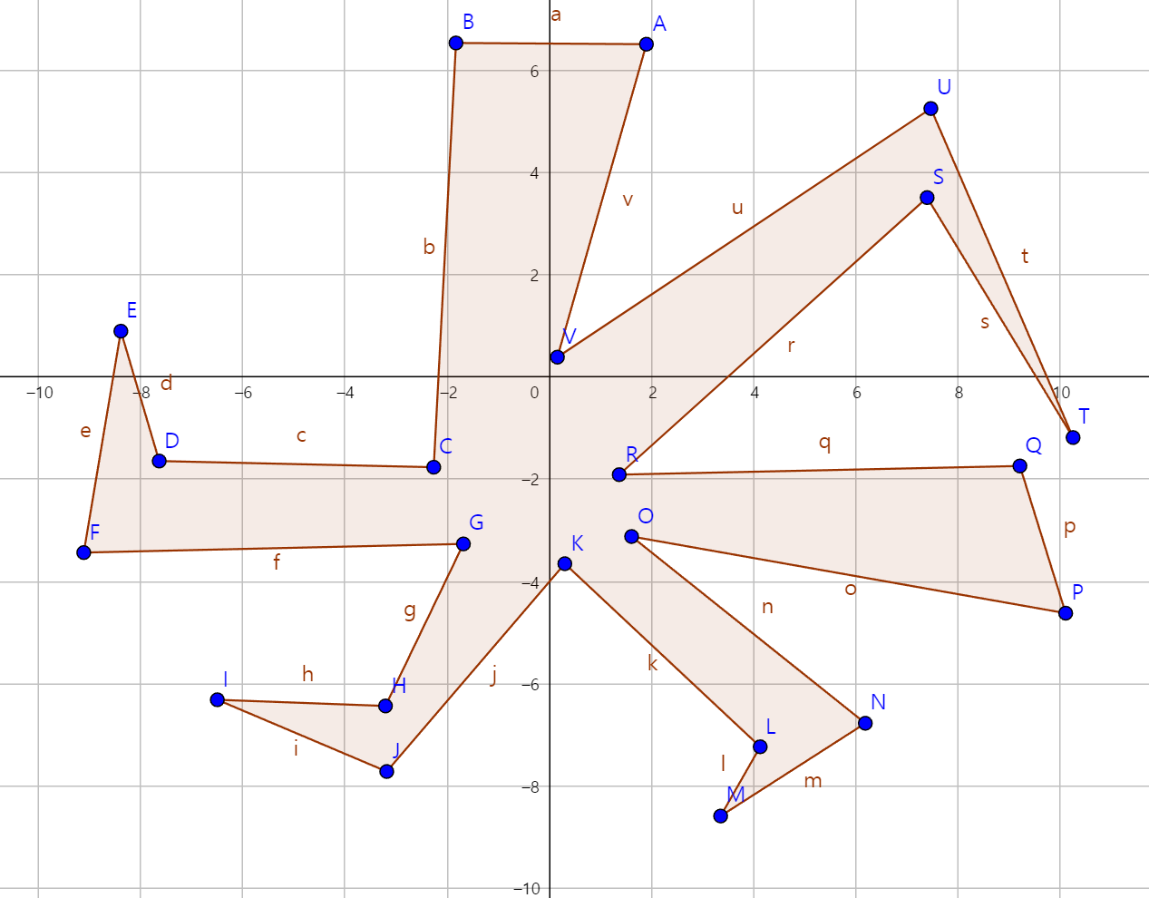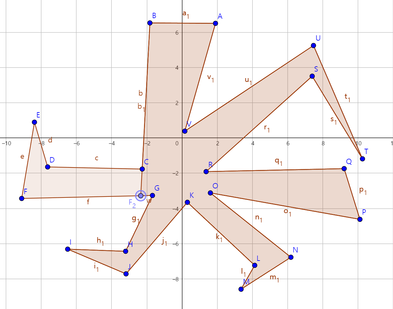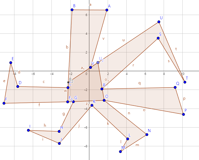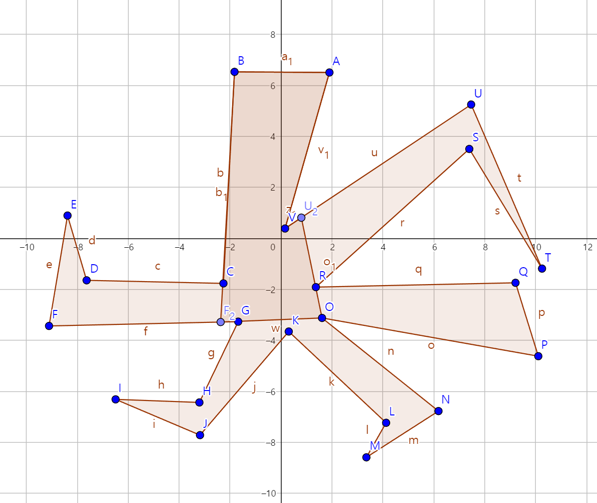 여기서 $A$에서 도달할 수 있는 영역부터 계산해 보기로 하자. 일단 $A$에서 $B$로 간다. 그리고 $B$에서 $C$로 간다. 이 때, $A, B, C$ 순서대로 보면 반시계방향이니 문제가 없다. 그다음에 $C$에서 $D$로 가는 경우를 보자. 이런 경우에는 $B,C,D$를 보면 시계방향으로 회전해버린다. 반대로말하면, $D$에서 $B$를 갈 때는 무조건 반시계방향으로 한 번 회전해야 한다는 뜻이다. 따라서 저 $D$쪽으로는 갈 수 없다. 그러니 그냥 $\overrightarrow{BC}$방향으로 쭉 간다. 그러면 $\overline{FG}$에 부딪힌다. 그러면 $\overline{FG}$에 부딪힌 교점을 $F_2$라 하자. 그러면 도형은 원래 $ABCDEFGHIJKLMNOPQRSTUV$순으로 그려져 있었는데 $ABCF_2GHIJKLMNOPQRSTUV$가 된 것이다.