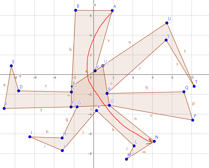 이렇게 $U_2B_2F_2O$의 볼록다각형이 만들어졌다. 볼록다각형인 이유는 반시계방향으로만 회전했으니 당연하다. 그런데 사실 이렇게 구한 도형의 영역은 $A$에서 반시계방향으로 갈 수 있는 모든 영역이 아니다. 예를 들면 $A$에서 $N$까지 반시계방향으로만 꺾으면서 충분히 갈 수 있다.